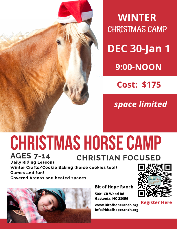 WINTER CHRISTMAS CAMPNote, this is a recreational camp and not a therapeutic camp. If you have a child with a diagnosis, please contact Mindy Millsaps before registering. Mindymillsaps@bitofhoperanch.org. REGISTER HERE