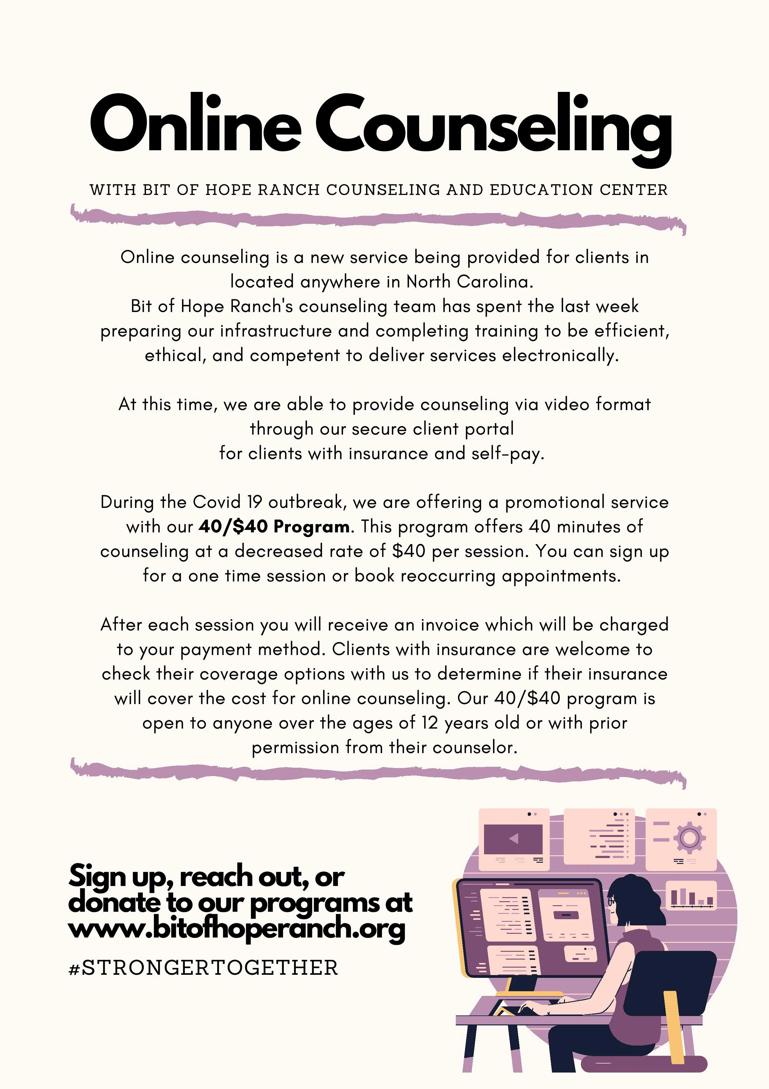 During the Covid-19 season, the Ranch is offering Online Counseling options for our clients that wish to remain at home. This confidential sessions are offered by our counseling staff Monday-Friday. If you are a current client, you can request an appointment through the portal. New clients can also sign up for a new patient appointment through the patient portal.